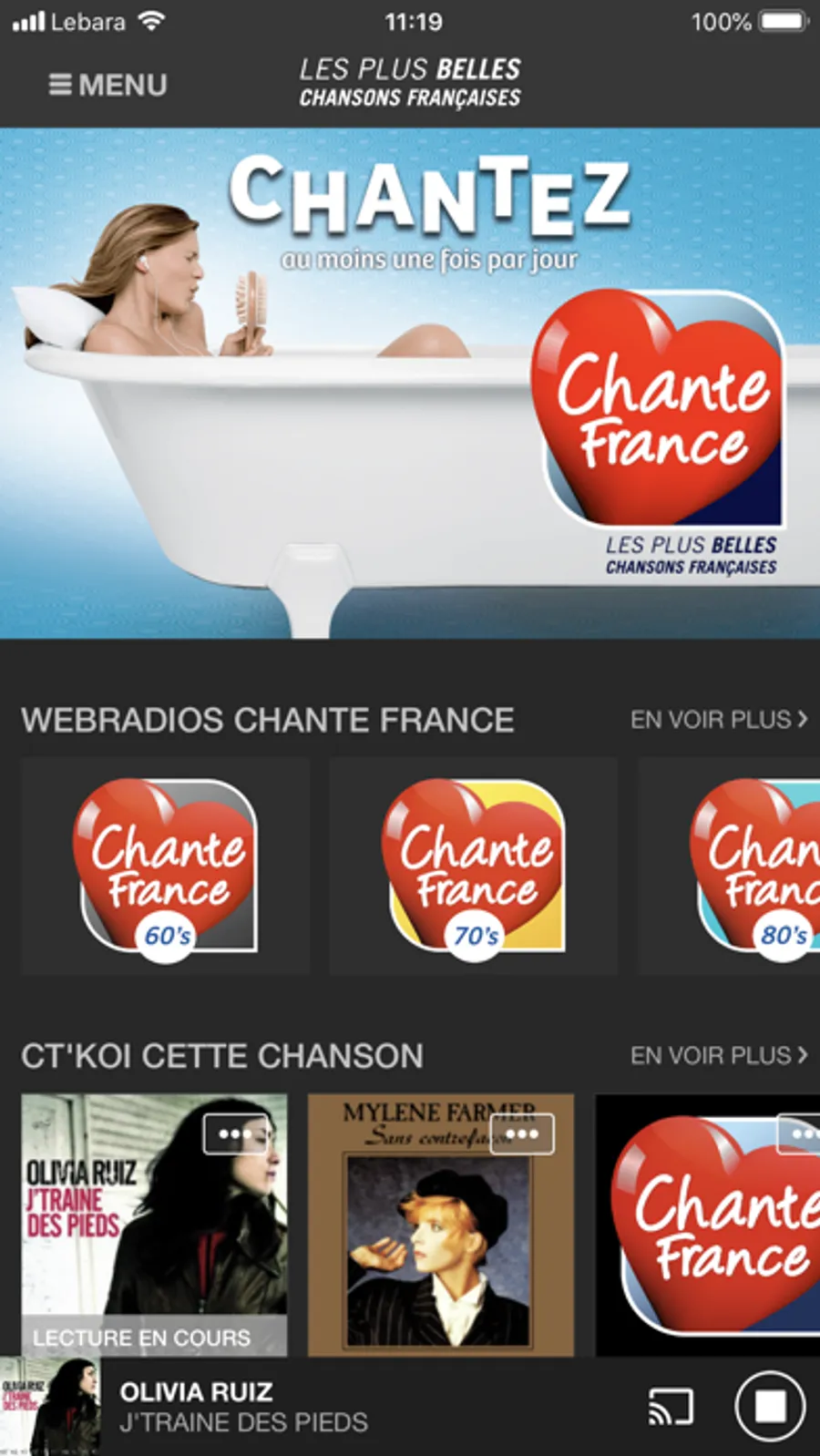 CHANTE FRANCE met à votre disposition tout l'univers de votre radio dans son application: Ecoute en direct, la recherche des titres diffusés avec le "CT Koi ?", les actualités de ses réseaux sociaux et une fonction réveil.