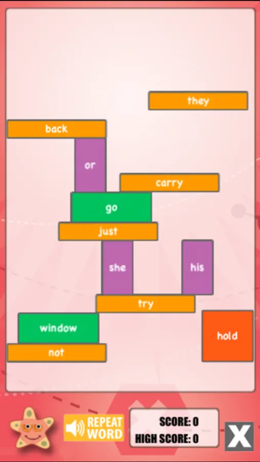 Stop the word blocks from stacking up to the top of the screen! Tap on the word the BINGO bug speaks to get rid of the block. Tilt the device to change where the block lands. Try not to click on the wrong word or you’ll lose points and the block will stay forever.