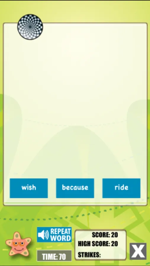 You have one hundred seconds to find as many BINGO Bugs as possible and fling them into the warp zone! To find the bug, tap the word the BINGO bug speaks. If you tap the correct word, a BINGO Bug and a bungee cord will appear. Pull downward and left or right to aim the BINGO Bug toward the warp zone hole. Let go to fling the BINGO Bug! Bounce the bug off of the wall before going into the warp zone for more points. The game will end once you incorrectly recognize three words.