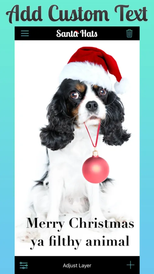 Make any photo ready for Christmas by adding Santa Hats to everyone in the photo! Simply load a photo into Santa Hats and tap the type of Santa Hat you want to add, then adjust the hat's size and placement and it will look like they are actually wearing the hat!