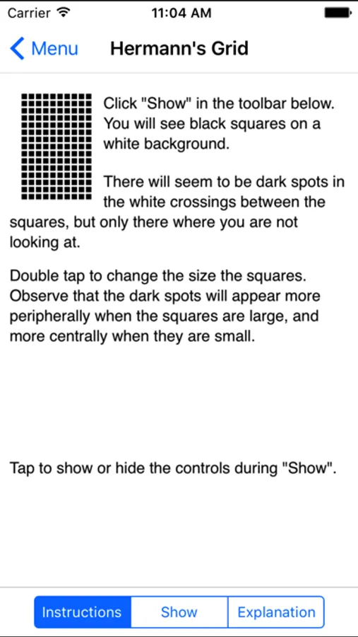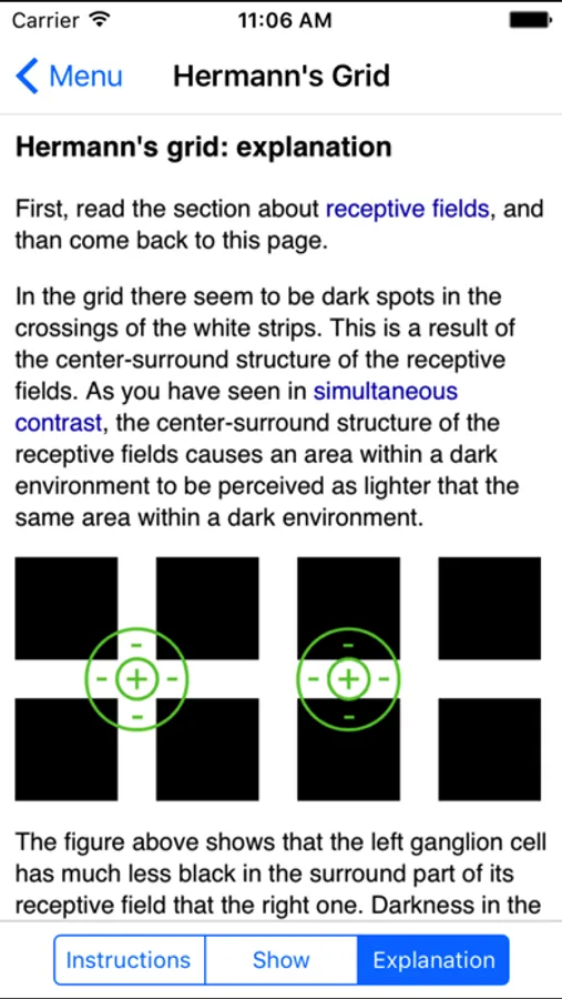 The user can choose from a list of visual illusions. Instructions on what to look for are provided, and the illusion is shown. Explanation of the illusion on a neuronal level is provided, which will assist the user in understanding the basics of neural information processing in the human brain.