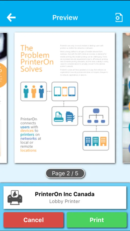 The PrinterOn iOS Printing App lets you easily search for and print to any PrinterOn-enabled Enterprise or Public Printing Location all from one application.