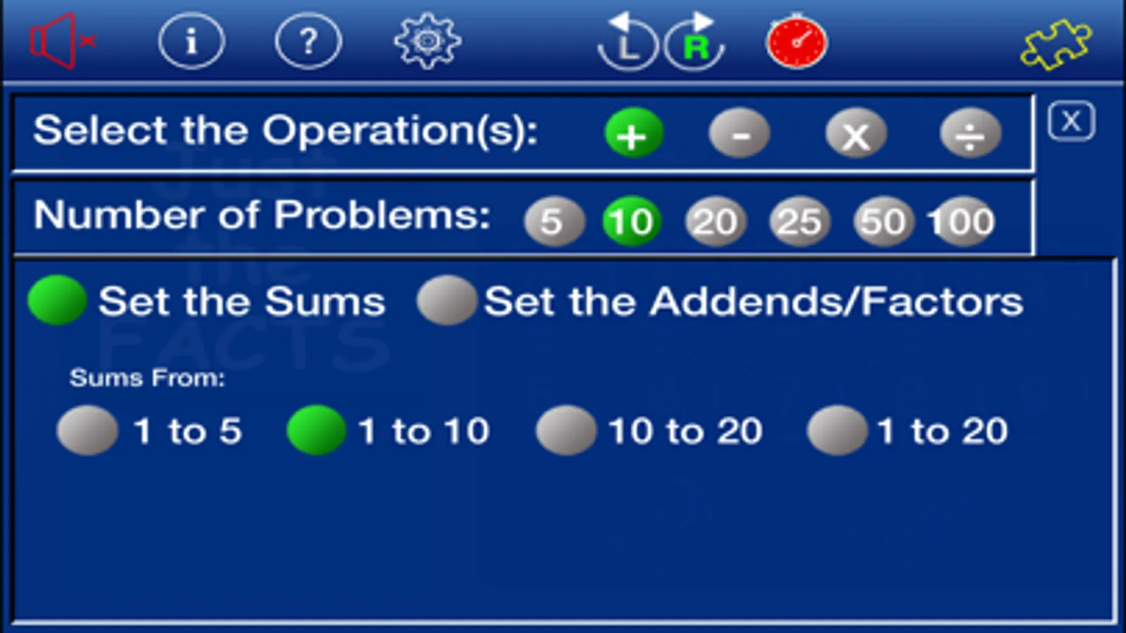 • At the request of Kindergarten and First Grade teachers the options include setting to work with Sums 1 to 5; Sums 1 to 10; Sums 1 to 20; Sums 5 to 10; Sums 10 to 15; Sums 15 to 20; Sums 10 to 20.