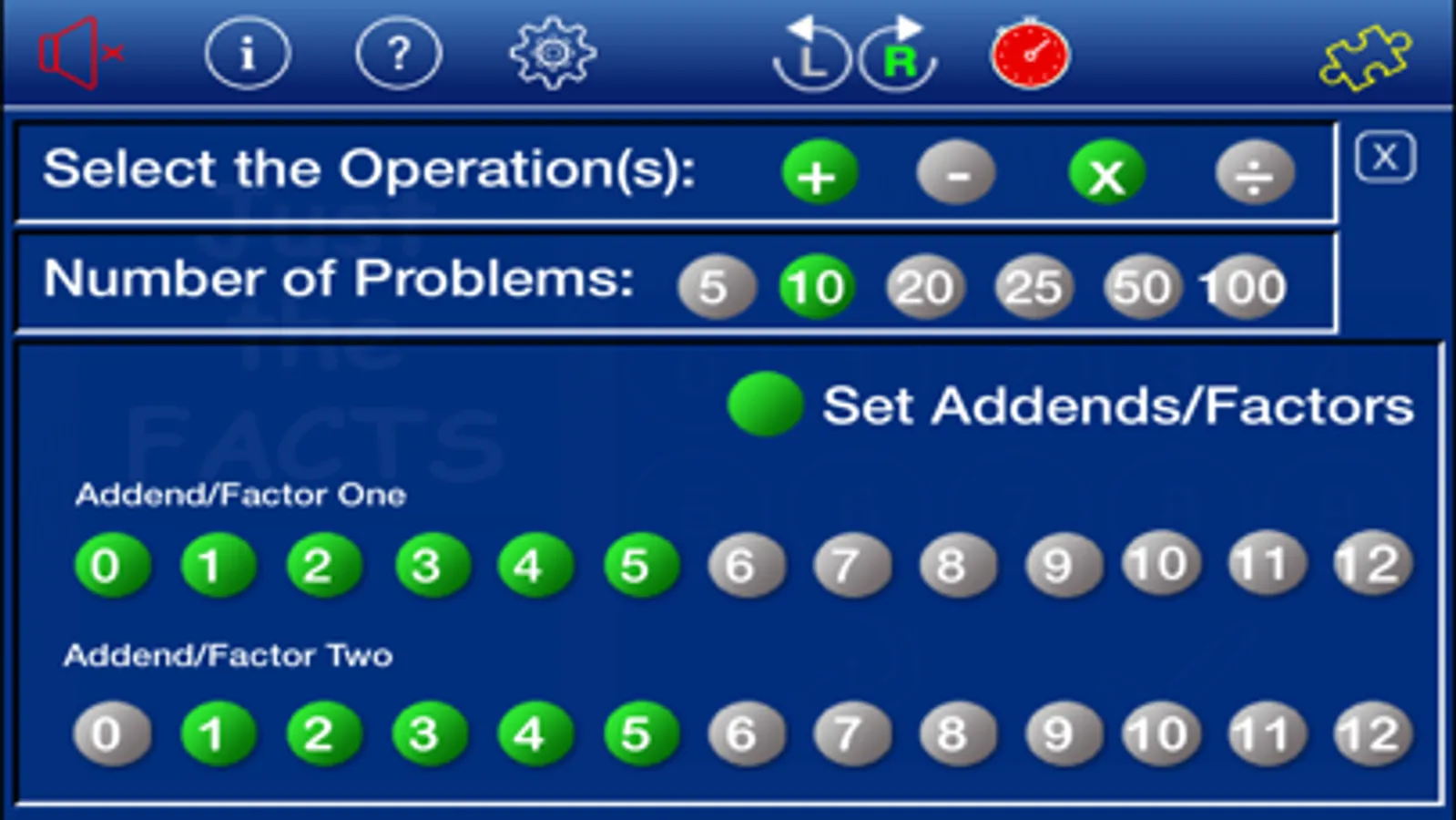 • Select to work with individual addends/factors up to 12 on the iPod and 25 on the iPad.