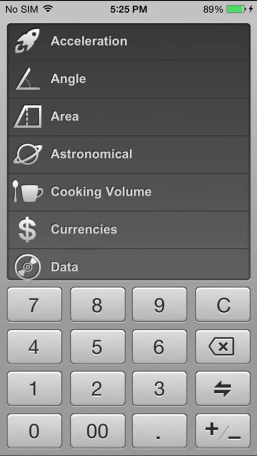 Acceleration, Angle, Area, Astronomical, Cooking Volume, Data, Data Transfer, Energy, Flow, Force, Frequency, Fuel, Length, Luminance, Power, Performance, Pressure, Radiation, Speed, Temperature, Time, Torque, Typography, Volume, Weight, Currencies