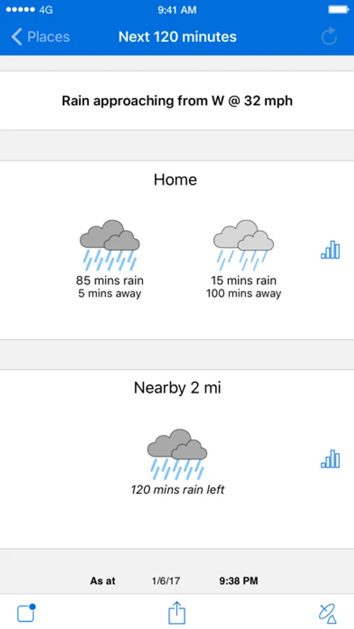 Rainspotting will tell you if there is any rain approaching your selected location or nearby, its direction, when it is expected to start, and how long it is expected to last. If you're really keen, you can even view the intensity profile of any approaching rain to draw your own conclusions. Rainspotting can also send notification alerts when rain is approaching (upgrade required).