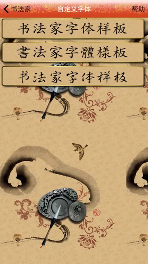 --《书法家》提供了“楷书”和“行书”等高质量字体内置其中,如果内置的“楷书”和“行书”还不能满足您的需要,您还可以到网上下载ttf字体通过itunes同步到《书法家》中进行自定义字体练习。这样就不单单是只有“楷书”和“行书”了,您可以采用任意字体进行练习了。