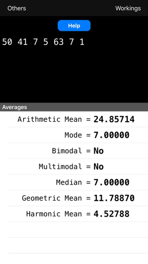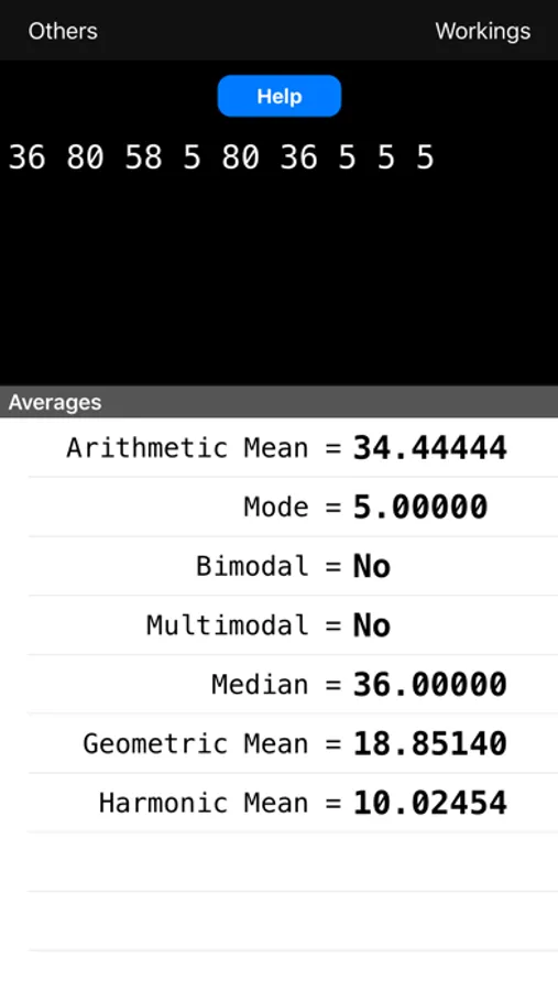 The App calculates the Mean (what most people call the average), the median, the modes, the geometric mean and the harmonic mean.