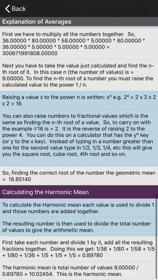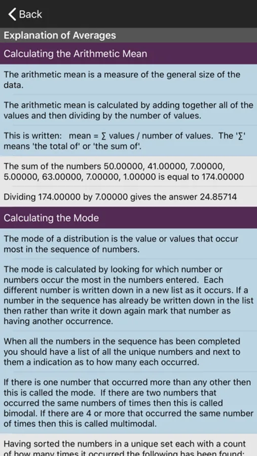 Just select the field at the top of the screen and a keypad will be shown. You type in the numbers in the sequence separating them using the space key (the empty key at the bottom left). When you have added all the numbers press the OK button. The keypad disappears and the answers are presented below in the table. On the iPhone there is another button at the top that leads to a page that explains how each of the averages was calculated. On the iPad the table to the right has the explanations.