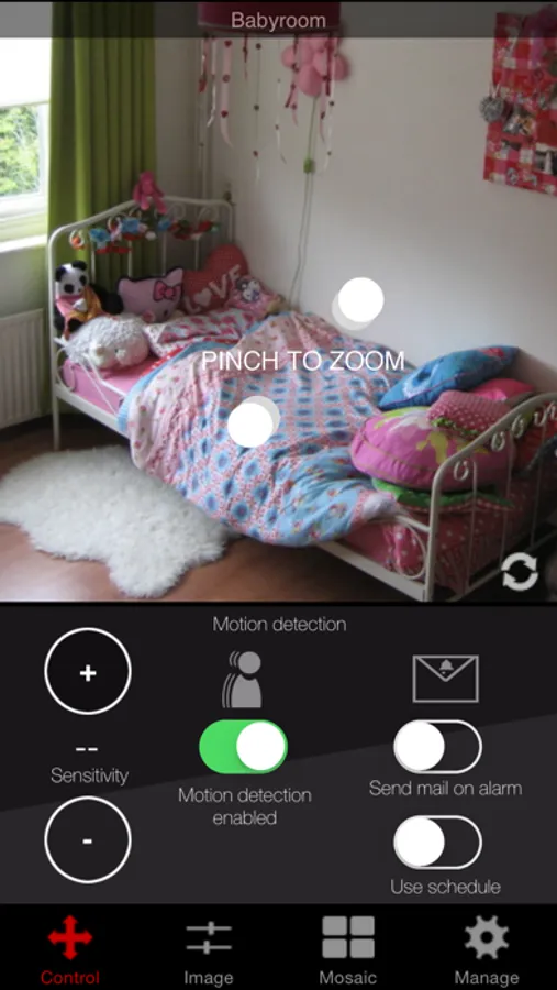 - Motion detection (only for cameras that support it): send mail on motion detection, set sensitivity, Quickly enable/disable the alarm