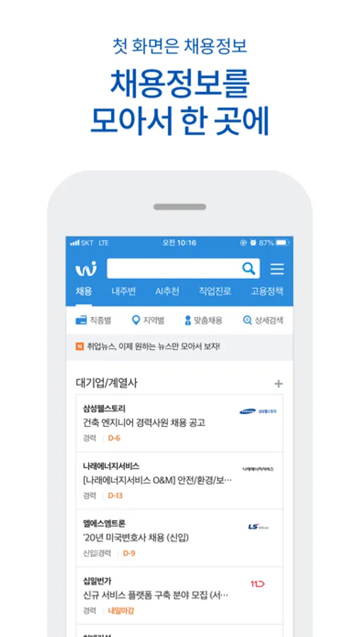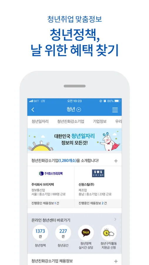 - 직종별, 지역별, 테마별(공채기업, 청년친화강소기업, 강소기업, 4차산업, 해외) 채용정보 제공