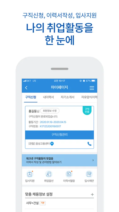 - 입사지원관리 : 입사지원, 알선, 입사제의 기업, 이력서 열람기업, 나를 찜한 기업 확인