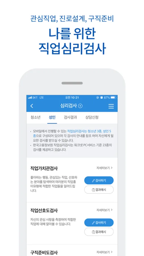 - 청소년, 성인, 대학생 직업 심리검사 및 상담 서비스 제공