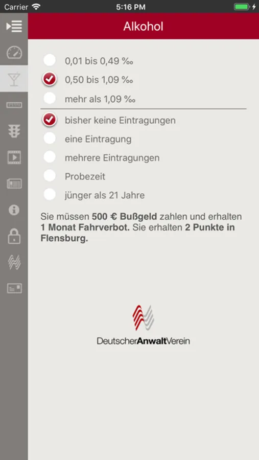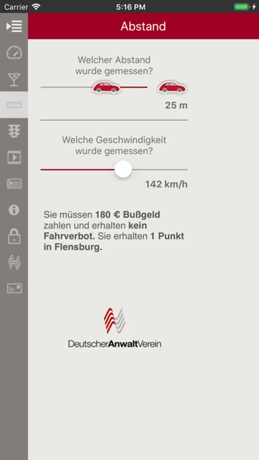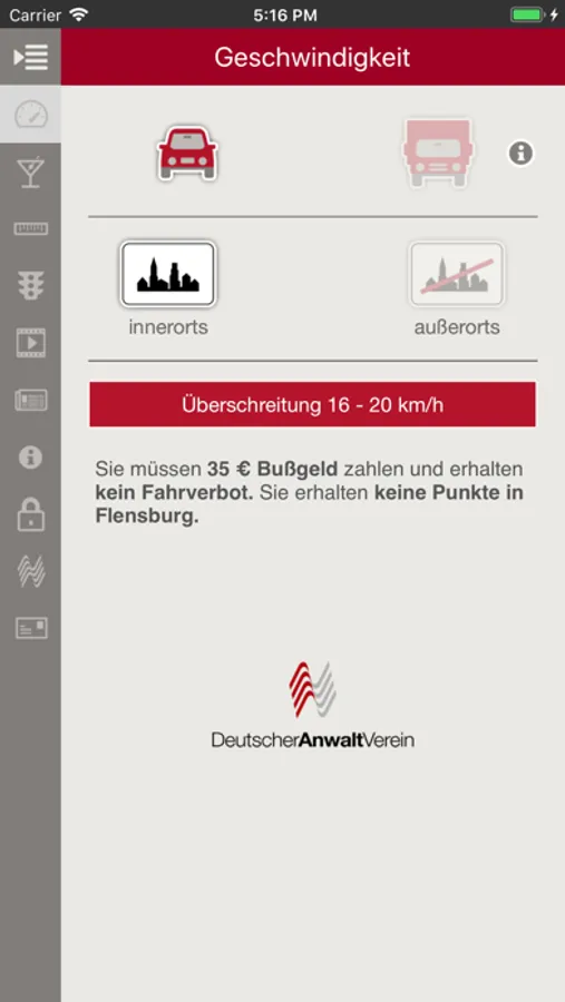 Sie möchten wissen, welche Strafe Sie bei Verkehrsverstößen erwartet? Dann ist die kostenlose App "DAV Bußgeldrechner 2021" die richtige Lösung. Der offizielle Bußgeldkatalog des Deutschen Anwaltvereins hilft Ihnen schnell und unkompliziert weiter. Zu schnell, bei Rot über die Ampel oder mit zu geringem Abstand gefahren? Mit nur wenigen Eingaben wissen Sie, was Sie erwartet. Im Rahmen der Geschwindigkeitsverstöße können Sie auch die Fahrzeugklasse (PKW oder LKW) auswählen.