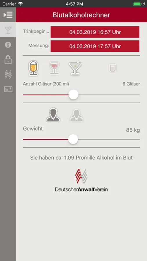 Der offizielle Blutalkoholrechner des Deutschen Anwaltvereins hilft Ihnen schnell und unkompliziert weiter. Mit nur wenigen Eingaben lässt sich die Blutalkoholkonzentration ermitteln. Die App unterscheidet zwischen den Geschlechtern, unterschiedlichem Gewicht und verschiedenen Alkoholarten. Zudem ermittelt die App die BAK (Blutalkoholkonzentration) im Verhältnis zu Trinkbeginn und Messzeitpunkt.