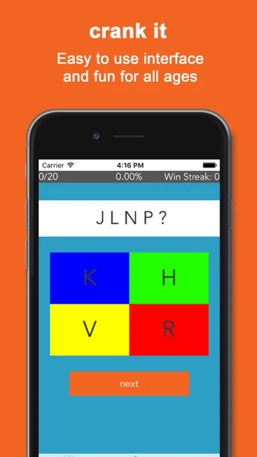 The object of the game is to determine the next letter of a given sequence. Different patterns of sequences are created algorithmically for an endless supply of combinations. Which means, the more you have to play, the stronger your mind becomes! It’s protein for the brain!