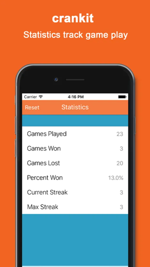 The application also provides statistics which can help you gauge your performance. Statistics kept include: number of games played, number of games won, max streak, etc.