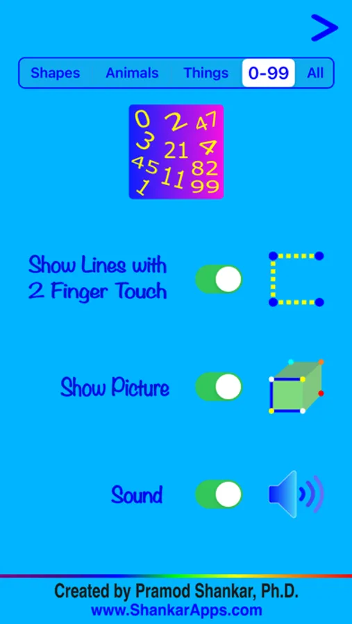At any given time, Dot Fun enables you to shake your device to start a new and different picture from one of three categories: Shapes, Animals and Things. An option is to select images randomly from within a category, or randomly from all categories. At your fingertips you also have a palette from which you can pick the line drawing color, and the option to enable or disable audio. Another option is to show a dimmed pictures that become brighter as more lines are drawn by connecting the right dots, and finally an option that displays unconnected lines at any time by touching the screen with two fingers – all options that truly inspire and assist younger children.