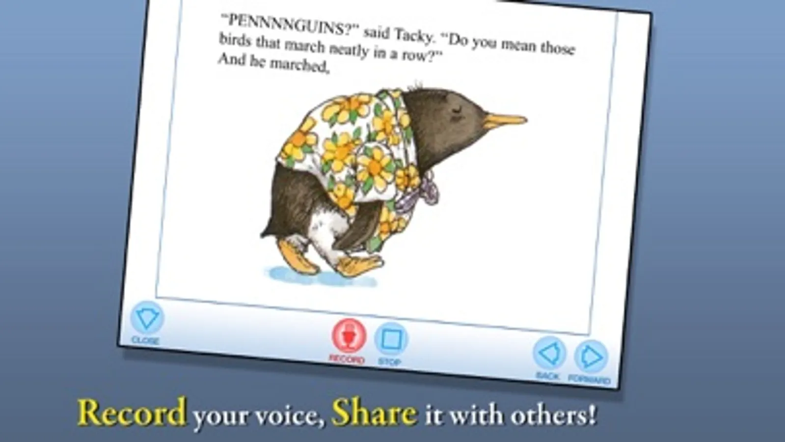 Dive into this interactive book app and meet Tacky the Penguin- an odd bird who marches to the beat of his own drummer! Explore pictures, learn new vocabulary, and personalize the story with your own narration. When hunters come to the penguins' Nice Icy Land, how will Tacky's individuality save the day?