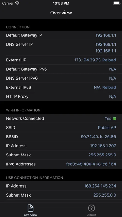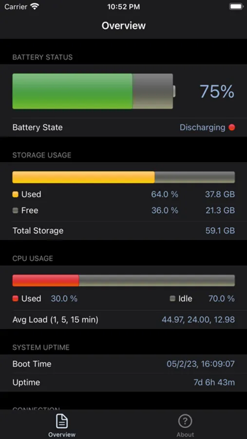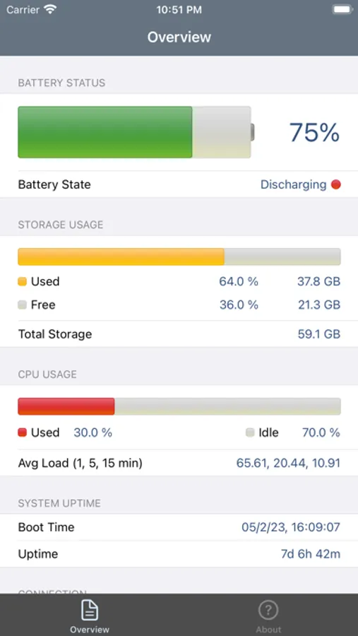 The lite version displays your device's basic parameters such as battery level, disk usage, CPU load and network connections.