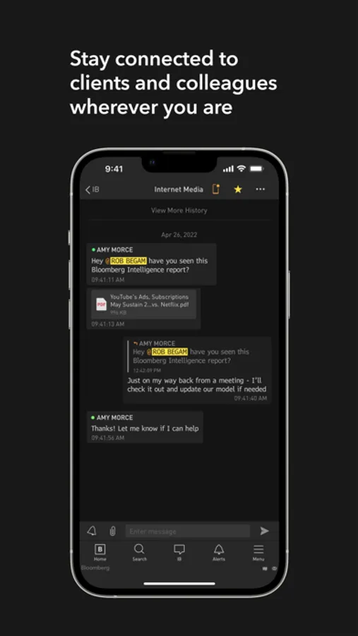 Stay connected to breaking news, markets, clients and colleagues with on-the-go access to key Bloomberg Terminal functionality.