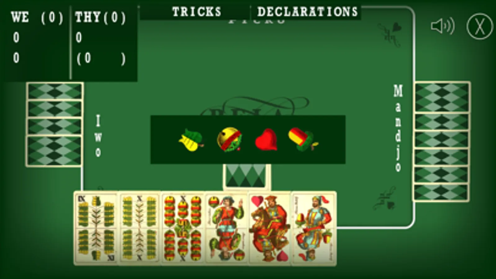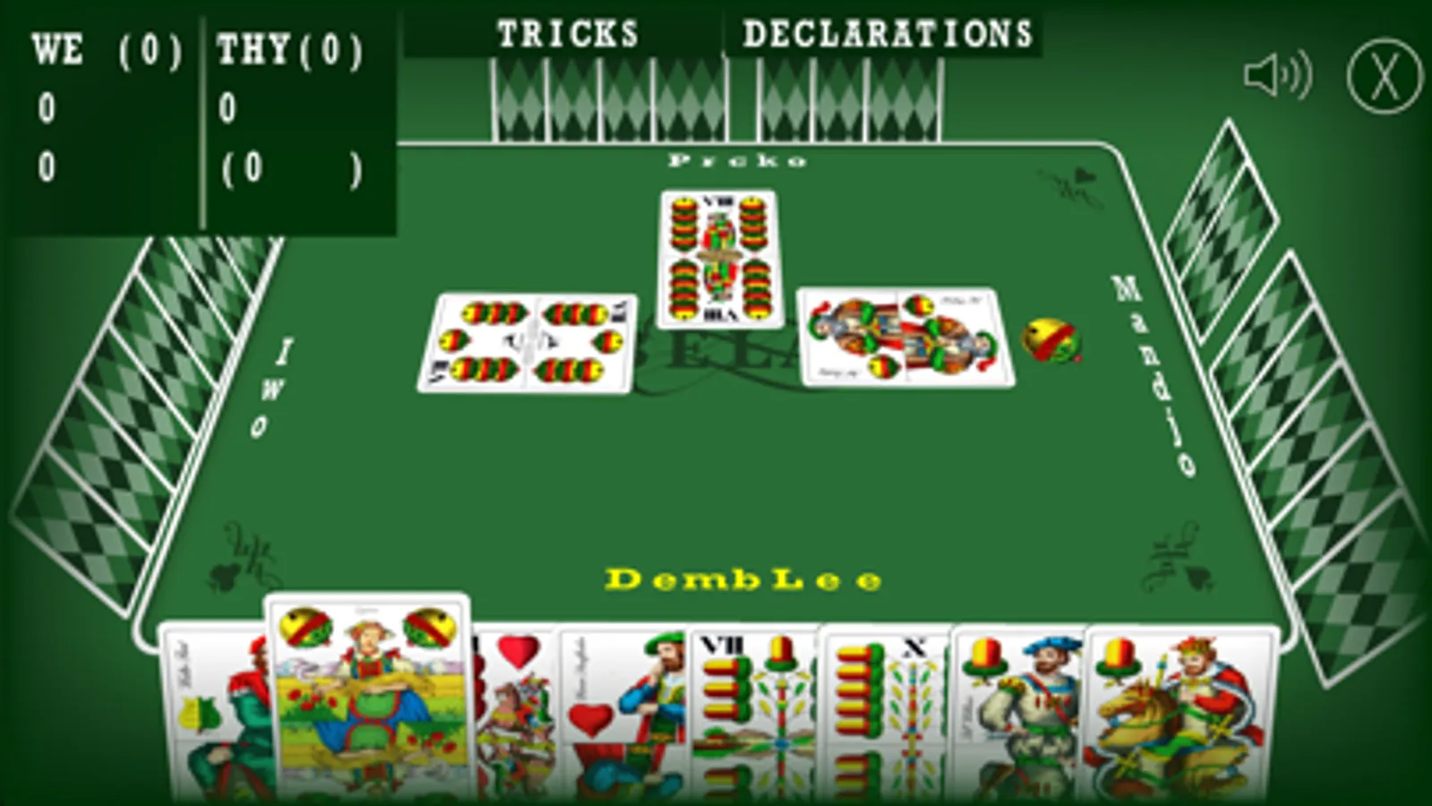 Game is played with 32 hungary styled cards. This card game is mostly played on Balkans, and some other parts of the world. You are playing a four player game, where you can play agains team of (so called) artificial intelligence players. Of course, your teammate is also AI player (also not so clever, for now …). Game supports English and Croatian language.