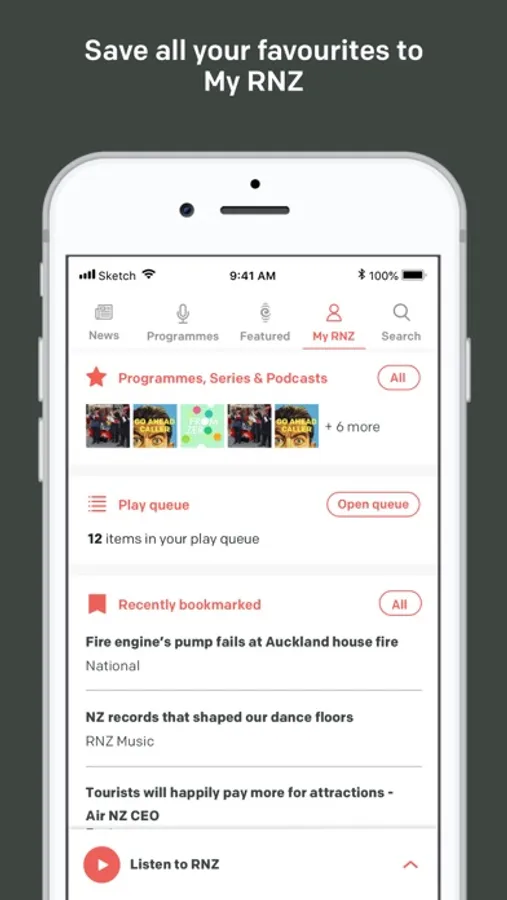 • Favourite or bookmark to ‘My RNZ’ and easily find and listen to the latest content from all your favourite radio programmes