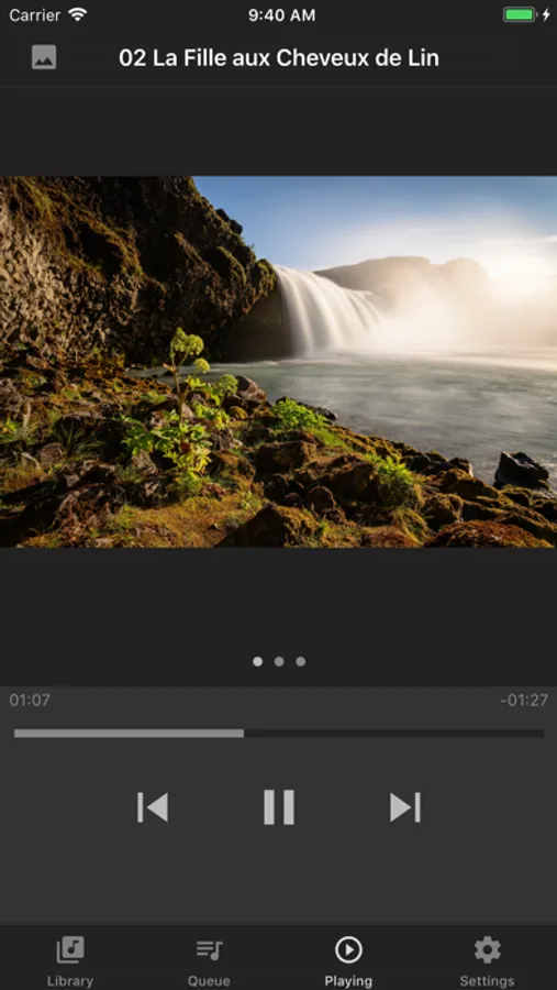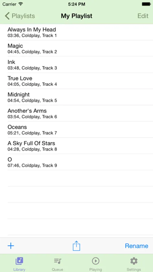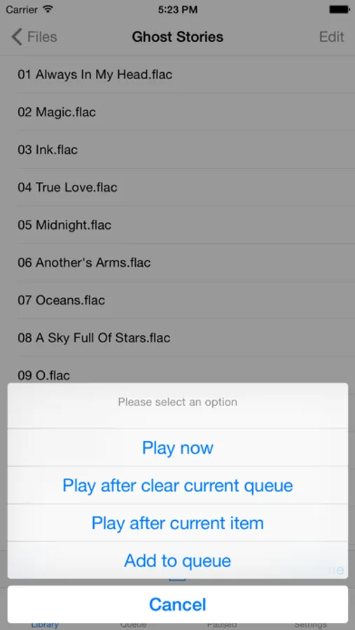 Music files can be grouped either by artists or by albums. You can also show all files in one single playlist, or only files in a chosen folder.