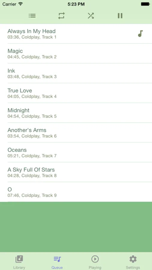 Golden Ear provides a straight forward control interface. You can use three playback modes: 1) Continuing in order; 2) Shuffle; 3) Loop one track/song.