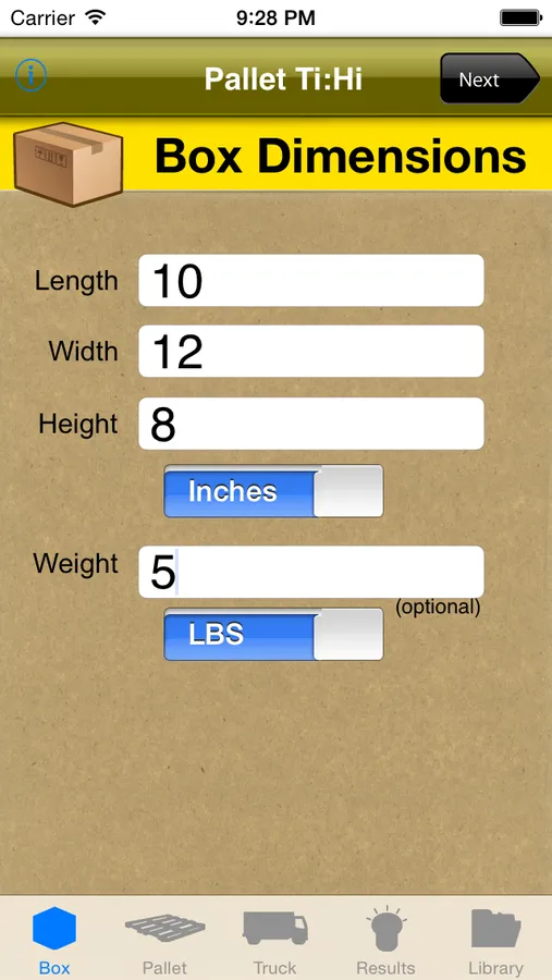 • Enter box weight as an option, weight inputs can be in pounds or kilograms