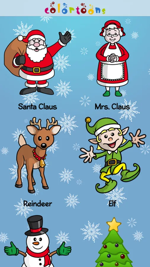 Colortoons is an interactive coloring book for children of all ages. With just a touch of their finger, your child will be able to color and doodle on festive Christmas themed cartoons. From Santa to Mrs. Claus, the Snowman and your favorite Reindeer, the entire Christmas gang is all here to enjoy.