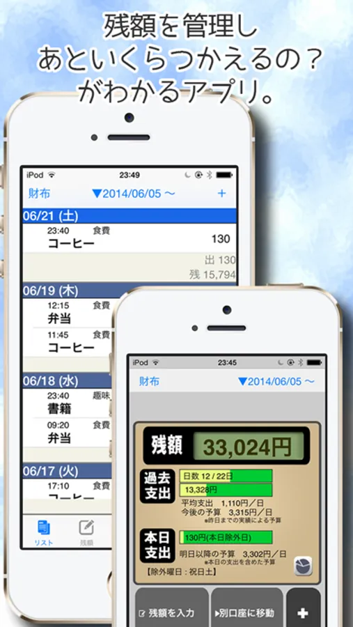 * With the remainder screen, I compare past average expenditure, a budget of after tomorrow with the remainder indication of a big font and grasp overuse!