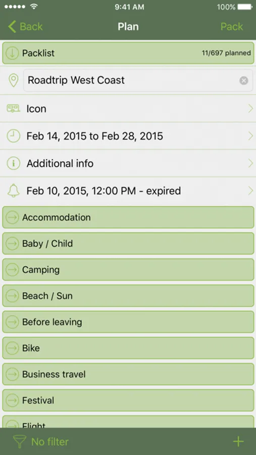 - Packing reminder push notification: Define a date when your device should remind you to start packing