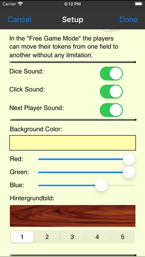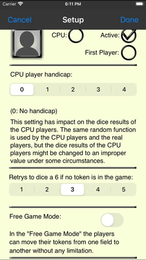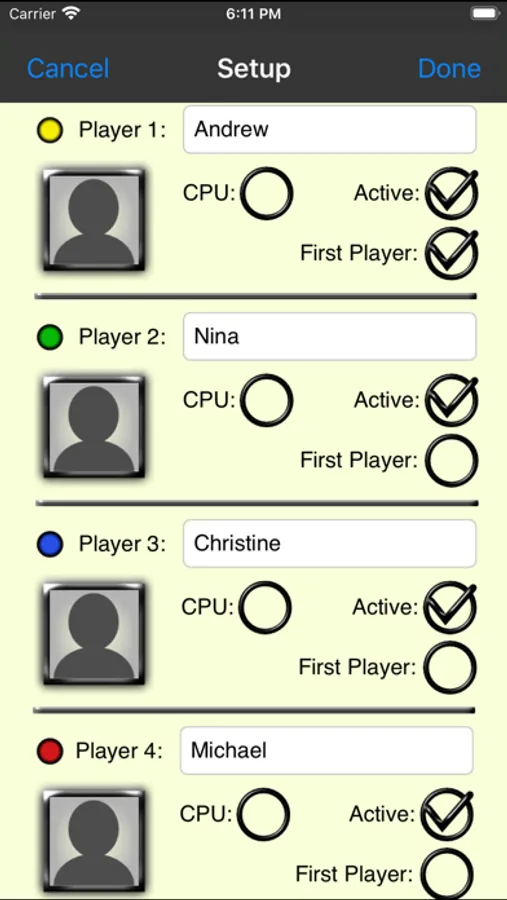 Unused colors can be switched off in the setup menu. The name of each player can also be set up here.