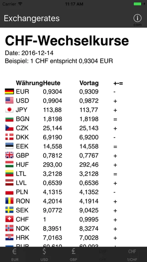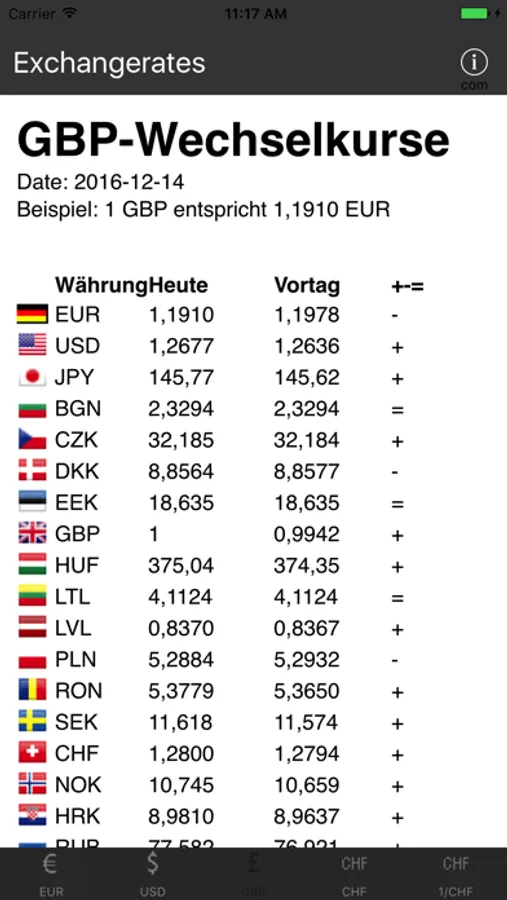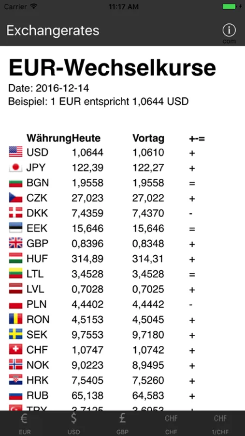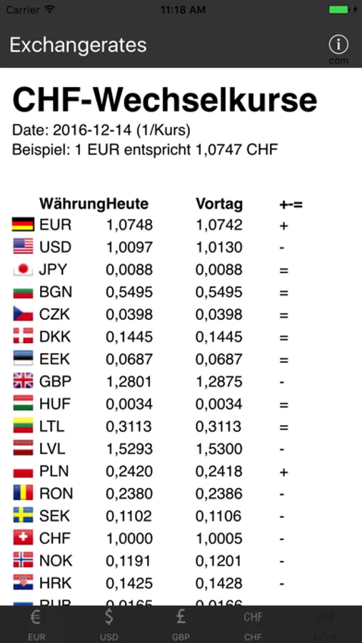 Exchangerates shows 33 currencies and base on EUR, USD, GBP and CHF. It is a universal app for iPhone and iPad. On the iPad is show the three contents side by side (Landscape). The data refresh come every day (Mo-Fr) at 02:15 pm.