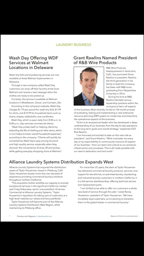 The coin laundry industry's leading publication is filled with in-depth articles, expert advice, laundry profiles and the largest, most comprehensive classified advertising section. The magazine is a resource for laundromat owners looking to grow or expand their business, as well for as potential investors researching the coin-op industry. The magazine is published by the Coin Laundry Association.