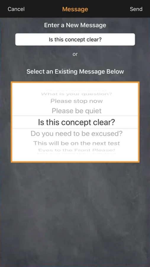 Customized messages can be sent to one, multiple, or all students. Select the students or use the implied all by selecting no students and touch the Send Message icon. Input a message or select an existing message and touch the Send button.