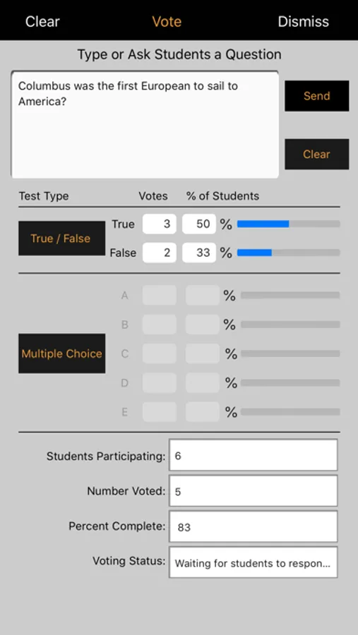 True/False, Multiple Choice, or Verbal questions can be sent to the students. Student results are tabulated and shown in real-time to the Teacher’s Assistant.