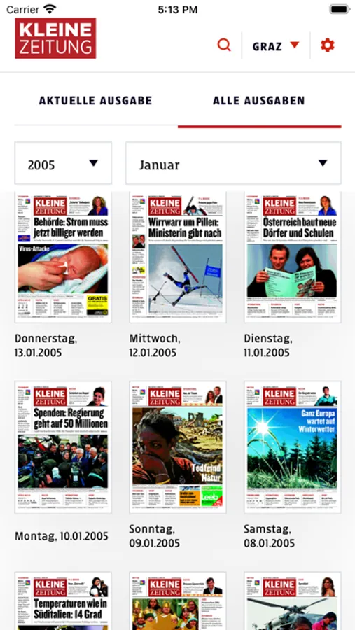 Mit der E-Paper App können Sie täglich alle 18 Regionalausgaben der Kleinen Zeitung bereits am Vorabend ab 23:30 Uhr lesen. Ob Nachteule, Frühaufsteher, Pendler oder „Zwischendurch-Leser“, mit der E-Paper App ist Ihre Kleine Zeitung im Originallayout auf allen gängigen Endgeräten jederzeit und überall verfügbar und mit dabei. Wobei nicht nur die jeweils aktuellen Ausgaben abrufbar sind, sondern für Interessierte auch alle Artikel der vergangenen 15 Jahre.