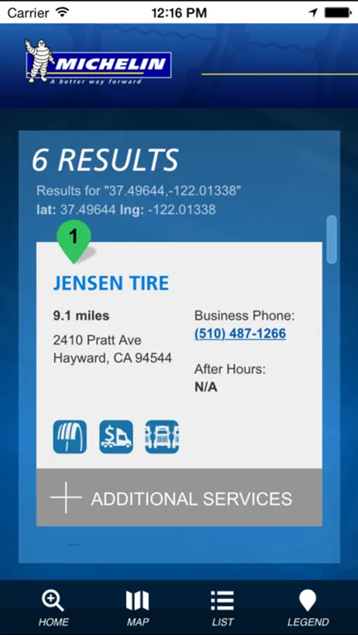 Now you can find the nearest MICHELIN® truck tire or service provider wherever you go, using your iPhone. Use the app to search for a provider by category, including emergency roadside service, travel plazas, on-site tire service or MRT providers, or use it to call MICHELIN® ONCall™ directly. The app finds the nearest service providers based on your GPS location, or another location you enter yourself. It also allows users to call the service provider, or store its information in their device's contacts or address book.