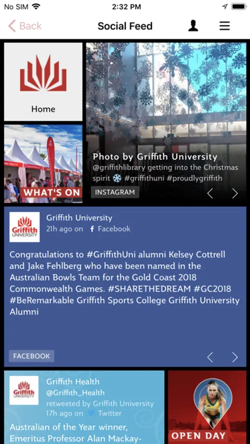 - Social Feed: aggregated feed of social media and news from Griffith.