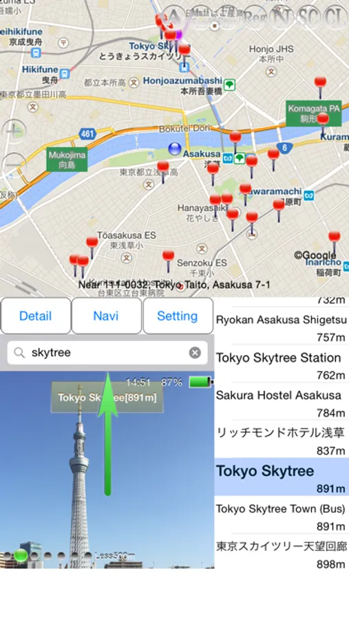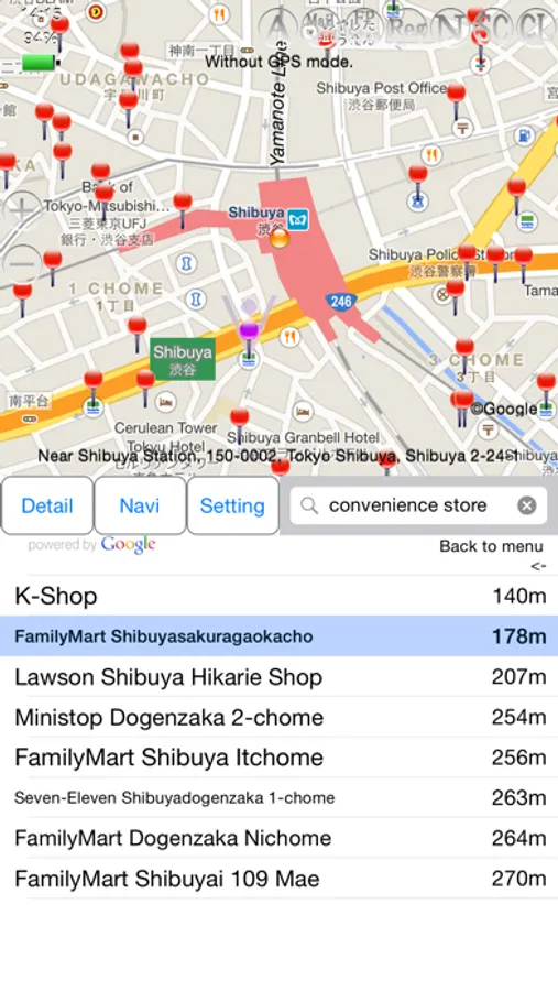 - set a search center point. The search with Google place is around this center point (= orange marble) (or current GPS location (= blue marble)). It is easier to find a place of purpose. And you can know results of shops list order by a straight-line distance between this center point (or current location) and a result. And you type "@#" in the search box in the state of destination selected (place of the search results or "Favorite place"), change and set a search center point on its place, It's convenient!