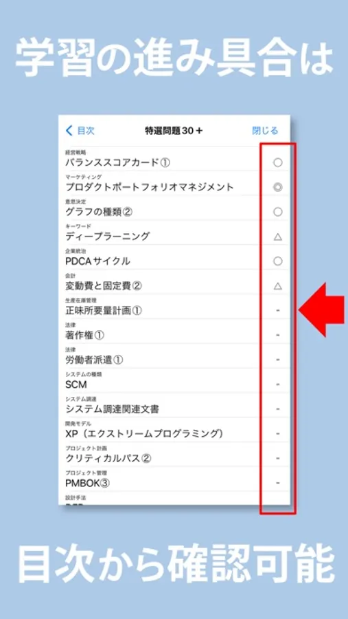 Additionally, results will be displayed on the table of contents. You will find your weak points at a glance. This feature support you to conquer your weakness. Let's get basic knowledge for the certification, and conquer your weak points with this application.
