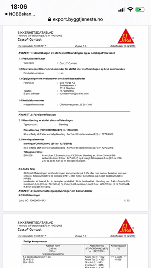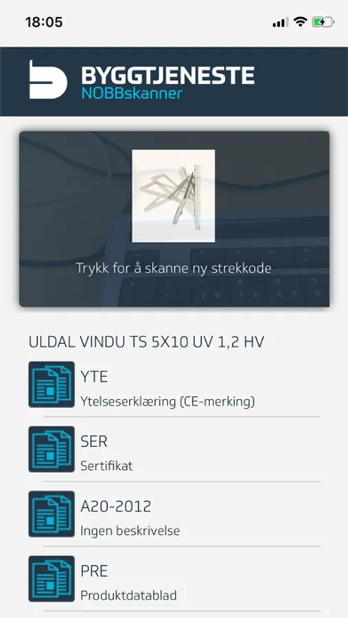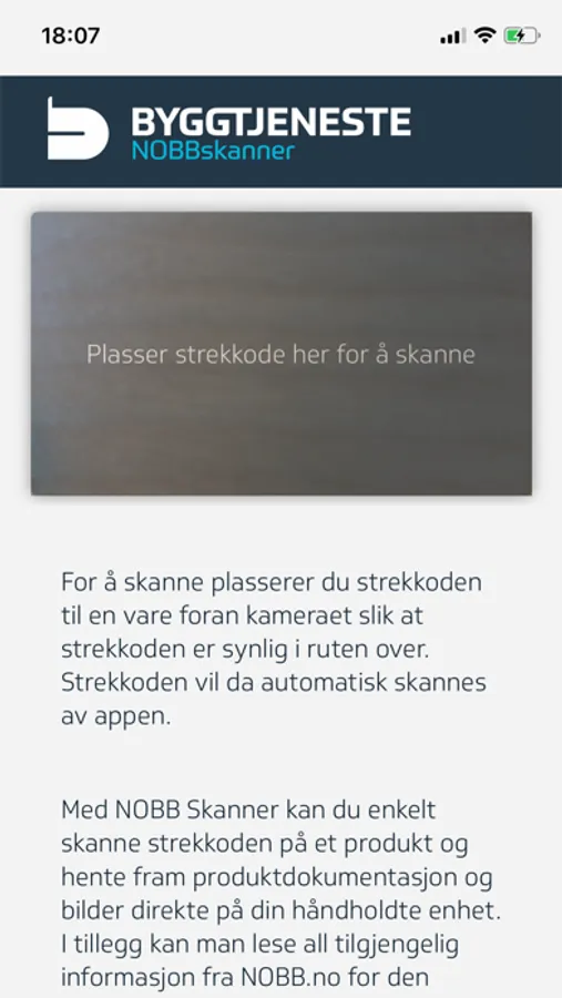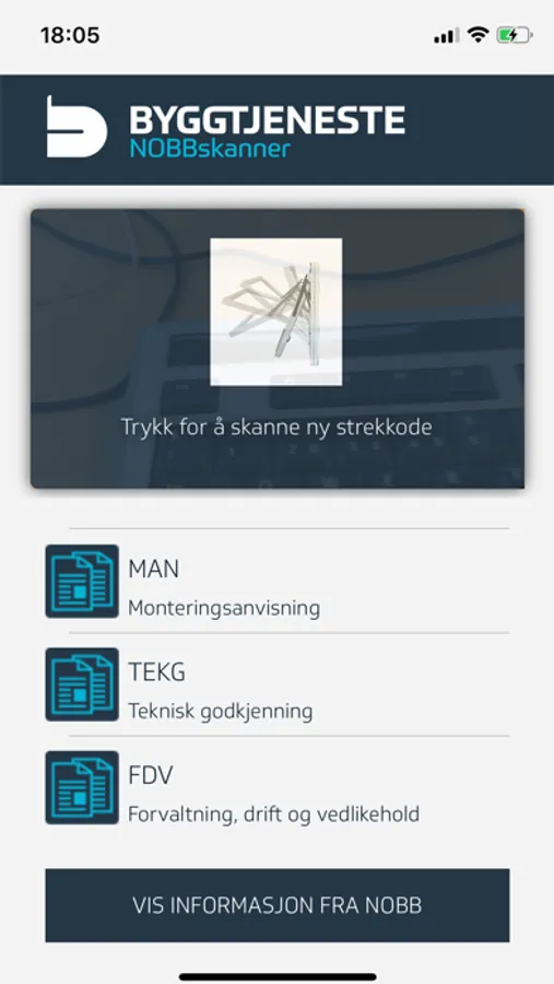 NOBBskanner identifies a building site-related product by reading its bar code. It then retrieves and displays associated product information from NOrsk ByggevareBase (NOBB). The information that can be accessed may include a range of document types in addition to pictures and videos.