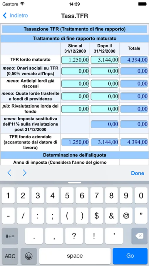 • TASSAZIONE DEL TFR: Consente di determinare l'imposta dovuta sul trattamento di fine rapporto di lavoro sia sulla quota maturata fino al 31/12/2000 che su quella maturata successivamente;
