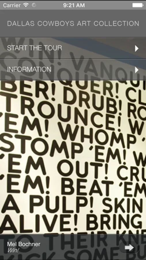 This unique mobile tour enables visitors and fans to explore the stadium's groundbreaking collection of contemporary art. Throughout the tour, you will hear from the people behind the art: the Jones family, whose vision and leadership made it all happen; the experts on the AT&T Stadium Art Council, who guided the Jones' every step of the way; and of course, the artists themselves. You will also see photos and videos of the artworks in all stages of production and installation, along with exclusive interviews.