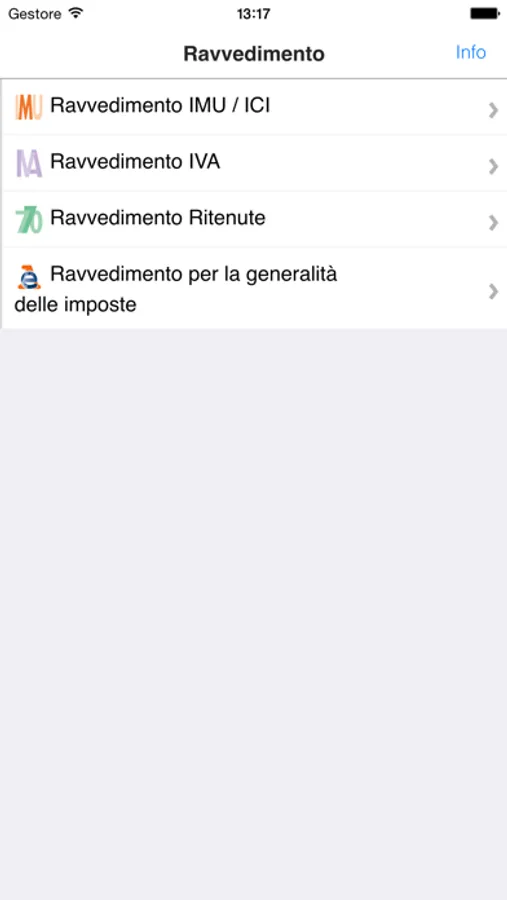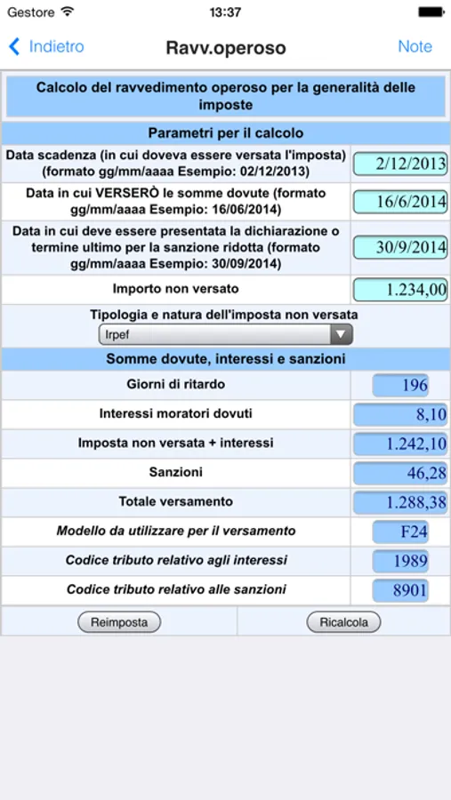 • RAVVEDIMENTO PER LA GENERALITA' DELLE IMPOSTE: Consente di determinare l'importo degli interessi e delle sanzioni ridotte per regolarizzare omessi o tardivi versamenti relativi alla generalità delle imposte (IRPEF, IRAP, IRES ed altre imposte dirette e indirette).