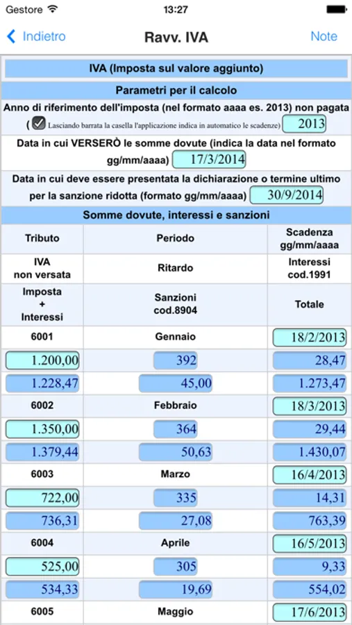 • RAVVEDIMENTO IVA: Consente di determinare l'importo degli interessi e delle sanzioni ridotte per regolarizzare omessi o tardivi versamenti mensili, trimestrali, in acconto e a saldo annuale, relativi all'imposta sul valore aggiunto;