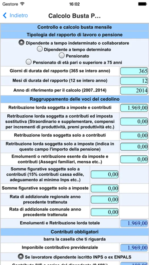 • CONTROLLO E CALCOLO BUSTA PAGA: Consente di controllare i calcoli relativi alla busta paga (o alla pensione) mensile ed in particolare i contributi e le imposte dovute mediante l’inserimento della retribuzione lorda e delle altre voci soggette e non soggette a imposte e contributi;