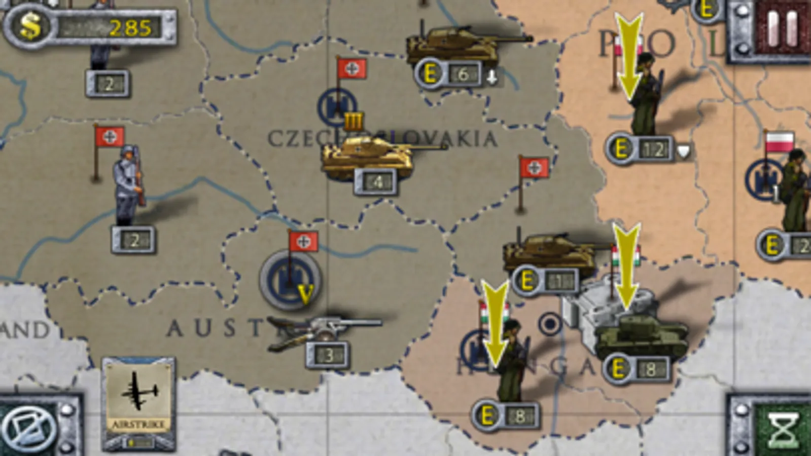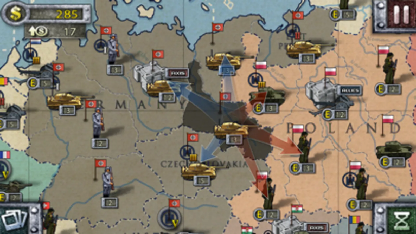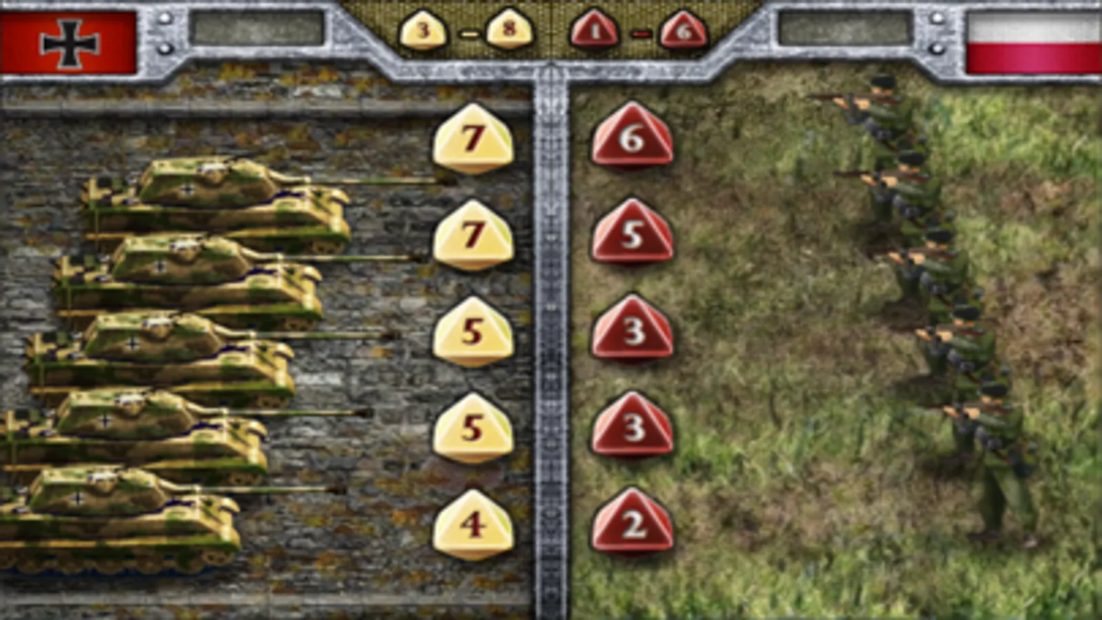 During the game you need to operate and distribute the three basic troops reasonably which include soldiers,tanks and artillery.(Soldier troop with high yields but general attack,tank troop with high attack and continue action when complete destroying the enemies,artillery troop attacks soldier troop and tank troop while they cannot strike back),judge on the current situation correctly at any time for the AI is outstanding.The attributes of arms are different from each country.For example,the tank of Germany is most powerful but with high price,the soldier of Soviet Union is cheapest,the navy of Britain is best.